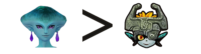 How does she relate to Midna? Well, she's a real bitch when you meet her, only caring about that stupid Spirital Stone. After you collect it, she really likes you, and treats you like royalty. Like how Midna only cares about her stupid twilight and not you, but unlike Ruto she never gets a change of heart. Ruto is better.